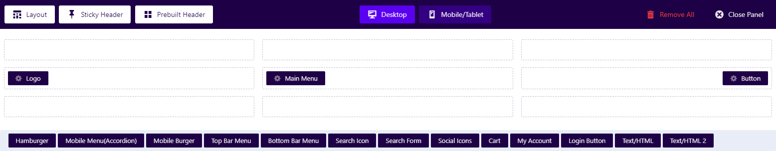 Drag & Drop Header builder with essential custom elements. You can build your mobile header as well as the desktop header.